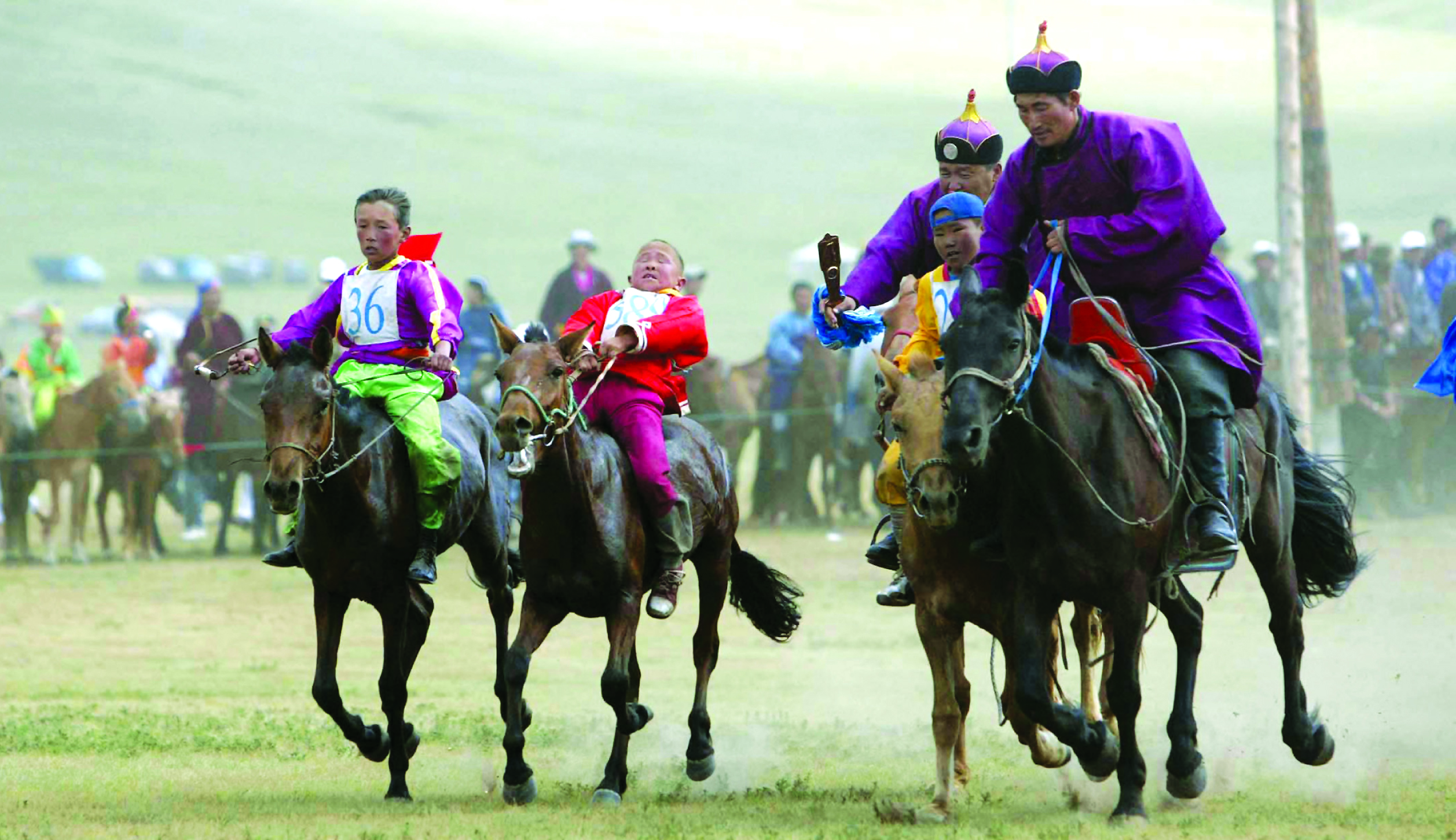 Vi reser ut på stäppen för att se festivalens hästkapplöpning. Ryttarna är ofta barn, och loppen kan vara tre mil långa. Tävlingen är ett av Mongoliets mest prestigefyllda evenemang.